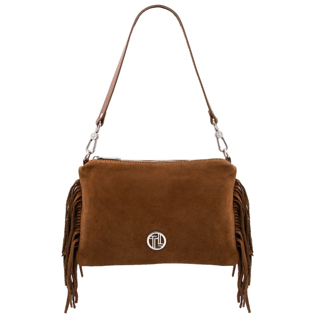 Deze clutch annex schoudertas van luxe suede leder met speelse franjes aan de zijkanten is uw perfecte metgezel voor elke gelegenheid.
