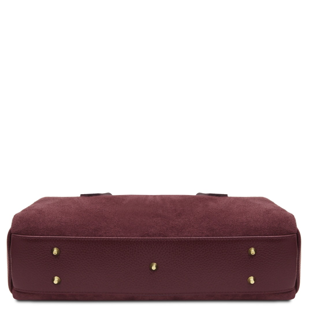 Gemaakt van traditioneel gelooid leer; uitgevoerd in suède en afgewerkt met leer in een subtiel kiezelsteenpatroon en met goudkleurige accenten.