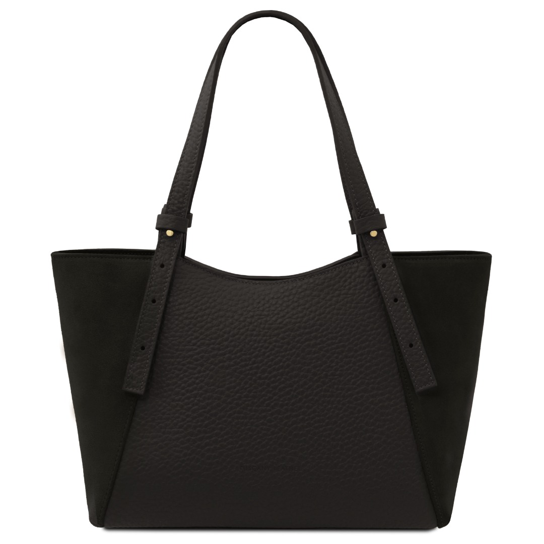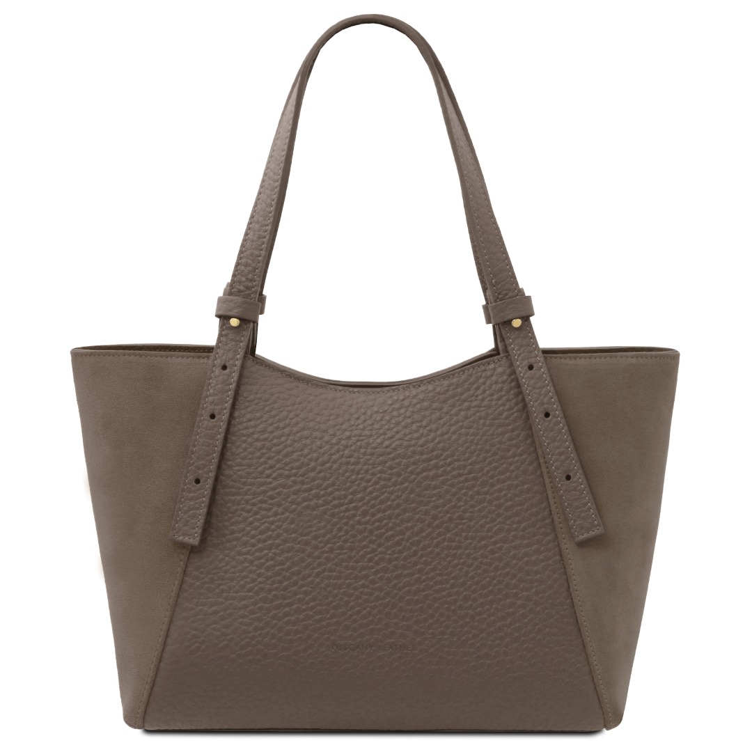Deze chique tas, gemaakt van een luxueuze mix van grofkorrelig leder met een kiezelsteenpatroon en fluweelzachte suede, straalt pure klasse uit.