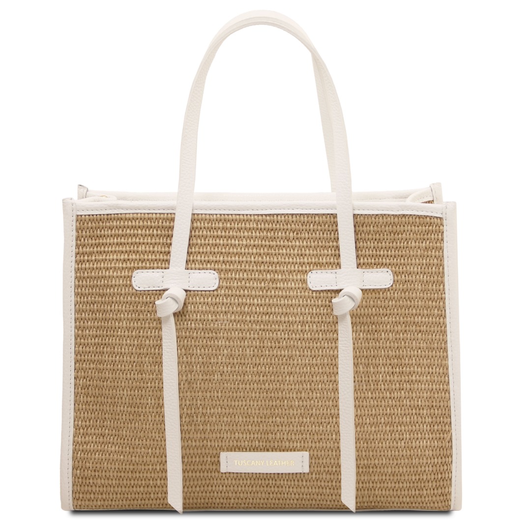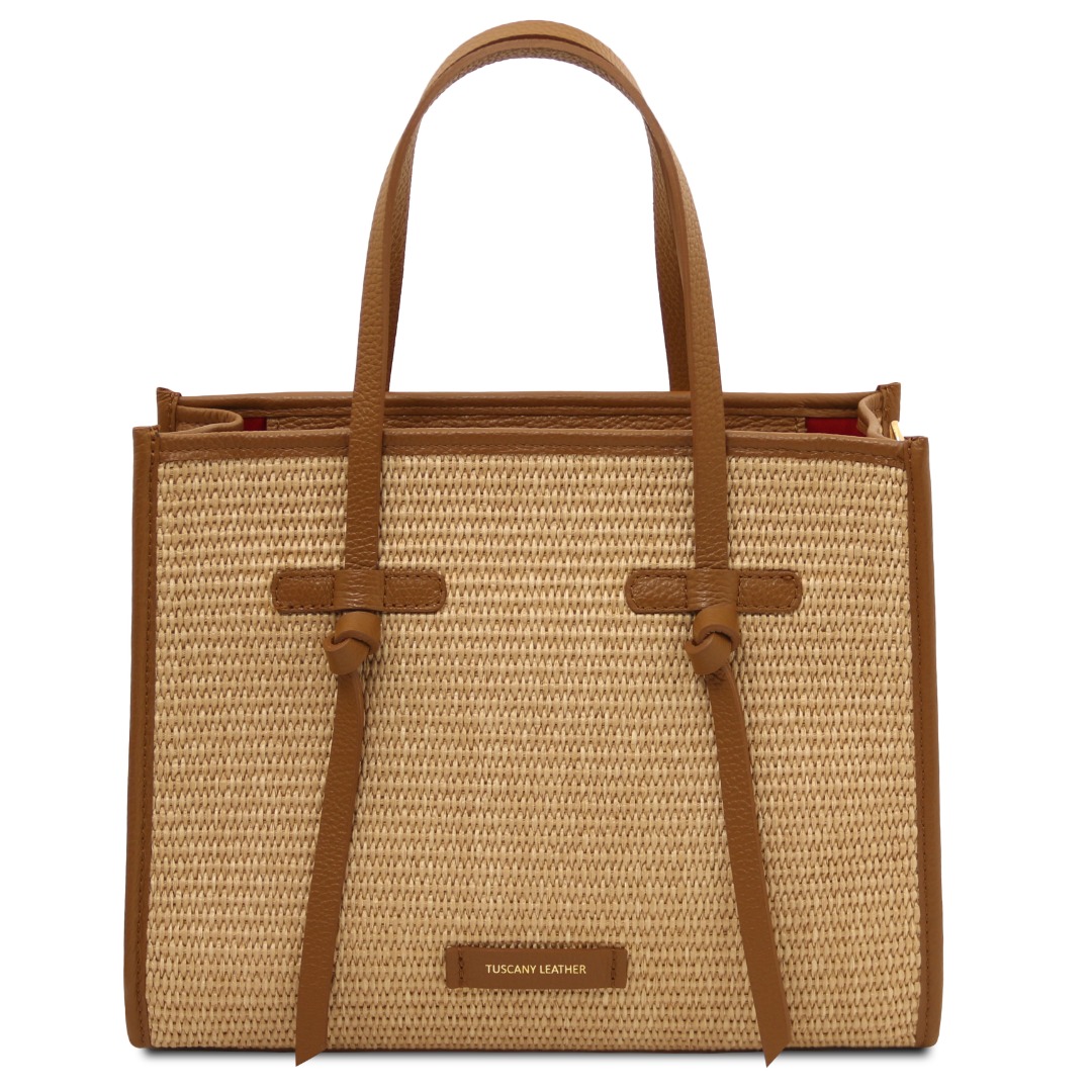 Deze duurzame, semi-rigide shopper met stro-effect textuur en lederen accenten biedt een unieke mix van natuurlijke materialen (katoen en leer) en praktische elegantie (A4-formaat).