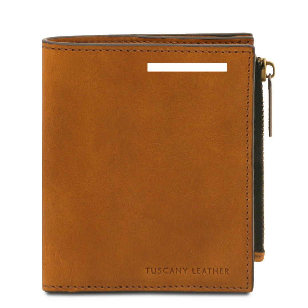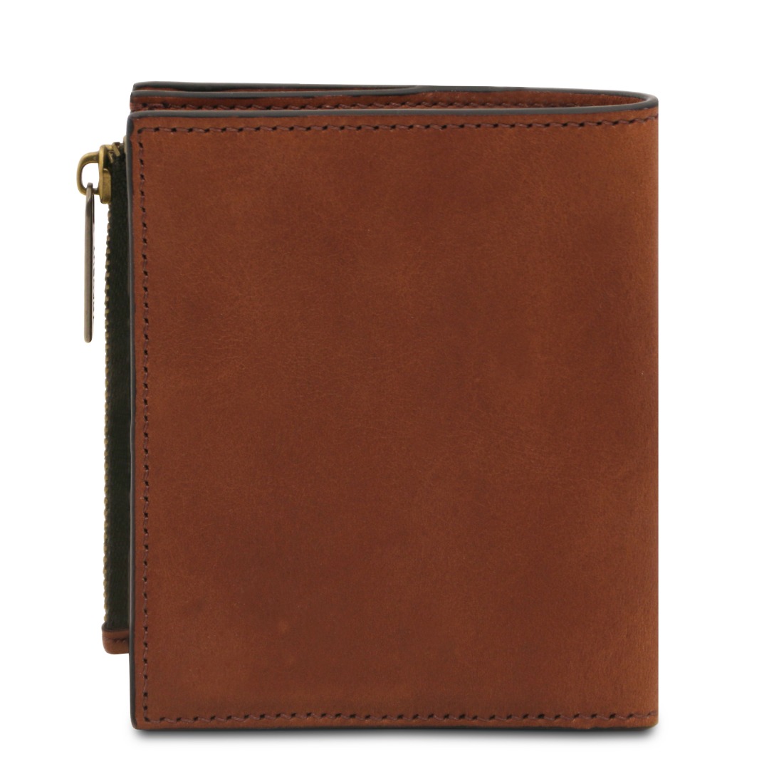 De portemonnee sluit veilig met een drukknop (snap button) en is afgewerkt met geborsteld koperkleurige hardware en een hot-stamped TL logo.