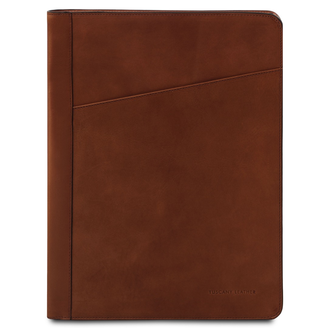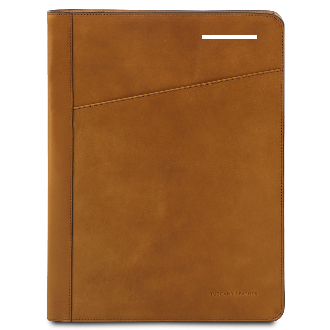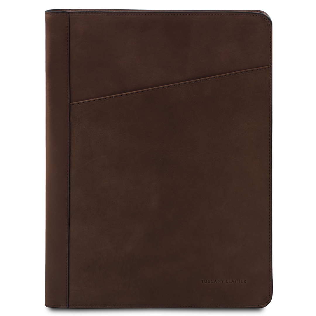 Deze elegante italiaanse conferentiemap van mat volnerf plantaardig en ambachtelijk gelooid leer heeft een discrete luxe finish en veroudert prachtig.