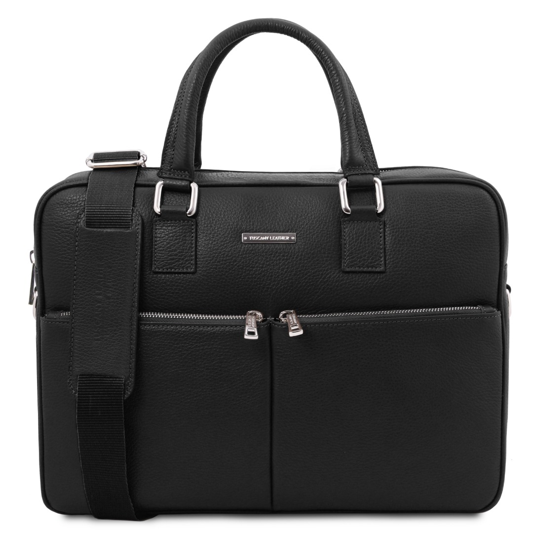 Deze elegante italiaanse aktetas-laptoptas is gemaakt van premium italiaans leer dat ambachtelijk en duurzaam is gelooid; heeft een prachtige reliëf-textuur en veroudert heel goed.